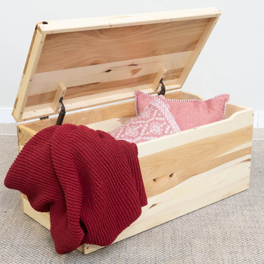 When you pick an Amish blanket chest, you will be able to choose from many different kinds of wood, including -but not limited to- Oak and Cherry wood. Most people love the clean lines in our blanket chests. With many other stain options, you can have a blanket chest that fits your style and needs.