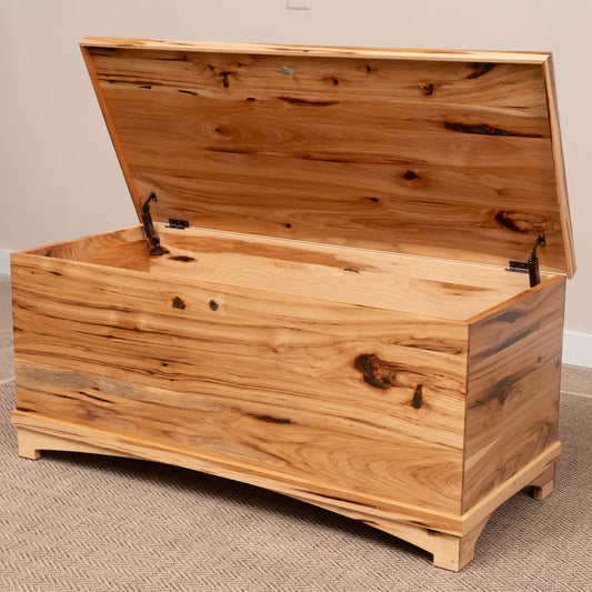 All of our cedar chests are crafted with cedar bottoms. This wood type is very special, as it deters insects and fungus from growing - protecting your keepsakes. We offer these chests in Hickory, Cherry, Walnut, and Brown Maple.