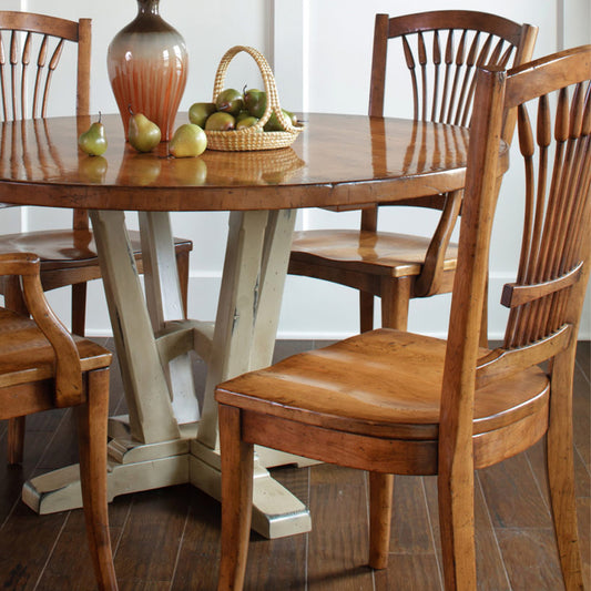 Here, you can find brown maple, spalted maple, reclaimed wood round tables and more with various bases. From a steel flared pedestal base to a solid wood pedestal base, you can choose the one that matches your home. Can opt for a drop leaf for an extendable dining table. All tables other than our live-edge tables have the option of adding middle leaves or breadboard extensions.