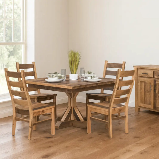 Like round tables, square tables have uniform tabletop dimensions making them a great choice for small spaces. It can be a great way to use a smaller dining room while creating an intimate setting and experience. All dining table tops are made of solid wood. Here, you'll find reclaimed wood, cherry, and quartersawn oak.