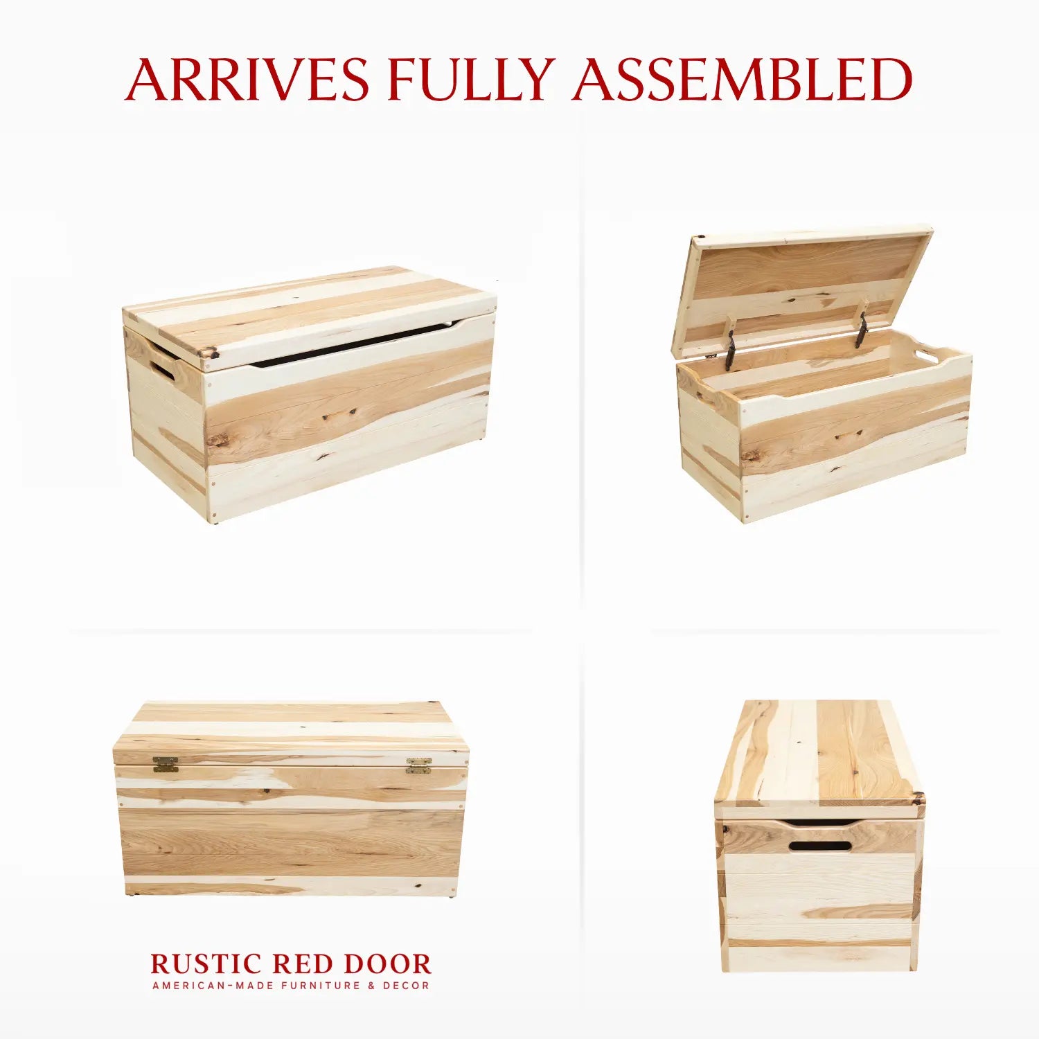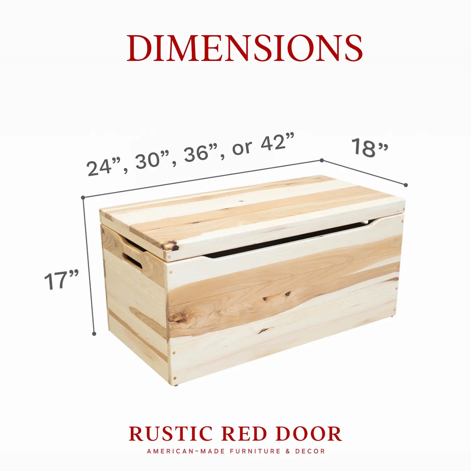 {"id":8248610521392,"title":"Palmer Hickory Blanket Chest, Natural Stain","handle":"palmer-hickory-blanket-chest","description":"\u003ch5\u003e\u003cstrong\u003eFeatures\u003c\/strong\u003e\u003c\/h5\u003e\n\u003cul\u003e\n\u003cli\u003eRustic Hickory Wood\u003c\/li\u003e\n\u003cli\u003eNatural Stain\u003c\/li\u003e\n\u003cli\u003ePre-Catalyzed Polyurethane\u003c\/li\u003e\n\u003cli\u003eAnti-Slam Hinges\u003c\/li\u003e\n\u003cli\u003eThree Sides Cut Out for Easy Opening and Closing\u003c\/li\u003e\n\u003cli\u003eEngraving includes a single panel (can take up to 4-8 weeks)\u003c\/li\u003e\n\u003cli\u003eSee images for font options\u003c\/li\u003e\n\u003cli\u003eSee our \u003ca href=\"https:\/\/rusticreddoor.com\/blogs\/rrd\/engraved-chests\" title=\"engraved chest gallery\" style=\"color: #b00304;\" rel=\"noopener\" target=\"_blank\"\u003egallery for engraved chest\u003c\/a\u003e\u003cspan\u003e ideas!\u003c\/span\u003e\n\u003c\/li\u003e\n\u003cli\u003e\u003cspan\u003e(Optional) Removable Tray\u003c\/span\u003e\u003c\/li\u003e\n\u003c\/ul\u003e\n\u003ch5\u003e\u003cstrong\u003eDimensions\u003c\/strong\u003e\u003c\/h5\u003e\n\u003cul\u003e\n\u003cli\u003eOutside Dimensions\u003c\/li\u003e\n\u003cul\u003e\n\u003cli\u003e24\" - 24”L x 18”D x 17”H\u003c\/li\u003e\n\u003cli\u003e30\" - 30”L x 18”D x 17”H\u003c\/li\u003e\n\u003cli\u003e36\" - 36”L x 18”D x 17”H\u003c\/li\u003e\n\u003cli\u003e42\" - 42\u003cspan\u003e”L x 18”D x 17”H\u003c\/span\u003e\u003cbr\u003e \u003c\/li\u003e\n\u003c\/ul\u003e\n\u003cli\u003eInside Dimensions\u003c\/li\u003e\n\u003cul\u003e\n\u003cli\u003e24\" - 22.5”L x 16.5”D x 14”H\u003c\/li\u003e\n\u003cli\u003e30\" - 28.5”L x 16.5”D x 14”H\u003c\/li\u003e\n\u003cli\u003e36\" - 34.5”L x 16.5”D x 14”H\u003c\/li\u003e\n\u003cli\u003e40\" - 3\u003cmeta charset=\"utf-8\"\u003e \u003cspan\u003e \u003c\/span\u003e\u003cspan\u003e8.5\"L\u003c\/span\u003e\u003cmeta charset=\"utf-8\"\u003e \u003cspan\u003e \u003c\/span\u003e\u003cspan\u003e x 16.5”D x 14”H\u003c\/span\u003e\n\u003c\/li\u003e\n\u003c\/ul\u003e\n\u003c\/ul\u003e","published_at":"2023-04-03T17:32:52-04:00","created_at":"2023-04-03T17:32:52-04:00","vendor":"Rustic Red Door Co.","type":"Chests","tags":["bf2023"],"price":54900,"price_min":54900,"price_max":117400,"available":true,"price_varies":true,"compare_at_price":null,"compare_at_price_min":0,"compare_at_price_max":0,"compare_at_price_varies":false,"variants":[{"id":49823161581872,"title":"24\" \/ No \/ No","option1":"24\"","option2":"No","option3":"No","sku":"CHST104223","requires_shipping":true,"taxable":true,"featured_image":null,"available":true,"name":"Palmer Hickory Blanket Chest, Natural Stain - 24\" \/ No \/ No","public_title":"24\" \/ No \/ No","options":["24\"","No","No"],"price":54900,"weight":0,"compare_at_price":null,"inventory_quantity":0,"inventory_management":"shopify","inventory_policy":"continue","barcode":null,"requires_selling_plan":false,"selling_plan_allocations":[]},{"id":49823161614640,"title":"24\" \/ Yes Engrave \/ No","option1":"24\"","option2":"Yes Engrave","option3":"No","sku":"CHST104223E","requires_shipping":true,"taxable":true,"featured_image":null,"available":true,"name":"Palmer Hickory Blanket Chest, Natural Stain - 24\" \/ Yes Engrave \/ No","public_title":"24\" \/ Yes Engrave \/ No","options":["24\"","Yes Engrave","No"],"price":64900,"weight":0,"compare_at_price":null,"inventory_quantity":0,"inventory_management":"shopify","inventory_policy":"continue","barcode":null,"requires_selling_plan":false,"selling_plan_allocations":[]},{"id":49823161647408,"title":"30\" \/ No \/ No","option1":"30\"","option2":"No","option3":"No","sku":"CHST104224","requires_shipping":true,"taxable":true,"featured_image":null,"available":true,"name":"Palmer Hickory Blanket Chest, Natural Stain - 30\" \/ No \/ No","public_title":"30\" \/ No \/ No","options":["30\"","No","No"],"price":59900,"weight":0,"compare_at_price":null,"inventory_quantity":1,"inventory_management":"shopify","inventory_policy":"continue","barcode":null,"requires_selling_plan":false,"selling_plan_allocations":[]},{"id":49823161680176,"title":"30\" \/ Yes Engrave \/ No","option1":"30\"","option2":"Yes Engrave","option3":"No","sku":"CHST104224E","requires_shipping":true,"taxable":true,"featured_image":null,"available":true,"name":"Palmer Hickory Blanket Chest, Natural Stain - 30\" \/ Yes Engrave \/ No","public_title":"30\" \/ Yes Engrave \/ No","options":["30\"","Yes Engrave","No"],"price":69900,"weight":0,"compare_at_price":null,"inventory_quantity":0,"inventory_management":"shopify","inventory_policy":"continue","barcode":null,"requires_selling_plan":false,"selling_plan_allocations":[]},{"id":49823161712944,"title":"36\" \/ No \/ No","option1":"36\"","option2":"No","option3":"No","sku":"CHST104222","requires_shipping":true,"taxable":true,"featured_image":null,"available":true,"name":"Palmer Hickory Blanket Chest, Natural Stain - 36\" \/ No \/ No","public_title":"36\" \/ No \/ No","options":["36\"","No","No"],"price":69900,"weight":0,"compare_at_price":null,"inventory_quantity":2,"inventory_management":"shopify","inventory_policy":"continue","barcode":null,"requires_selling_plan":false,"selling_plan_allocations":[]},{"id":49823161745712,"title":"36\" \/ Yes Engrave \/ No","option1":"36\"","option2":"Yes Engrave","option3":"No","sku":"CHST104222E","requires_shipping":true,"taxable":true,"featured_image":null,"available":true,"name":"Palmer Hickory Blanket Chest, Natural Stain - 36\" \/ Yes Engrave \/ No","public_title":"36\" \/ Yes Engrave \/ No","options":["36\"","Yes Engrave","No"],"price":79900,"weight":0,"compare_at_price":null,"inventory_quantity":0,"inventory_management":"shopify","inventory_policy":"continue","barcode":null,"requires_selling_plan":false,"selling_plan_allocations":[]},{"id":49823161778480,"title":"42\" \/ No \/ No","option1":"42\"","option2":"No","option3":"No","sku":"CHST104226","requires_shipping":true,"taxable":tru