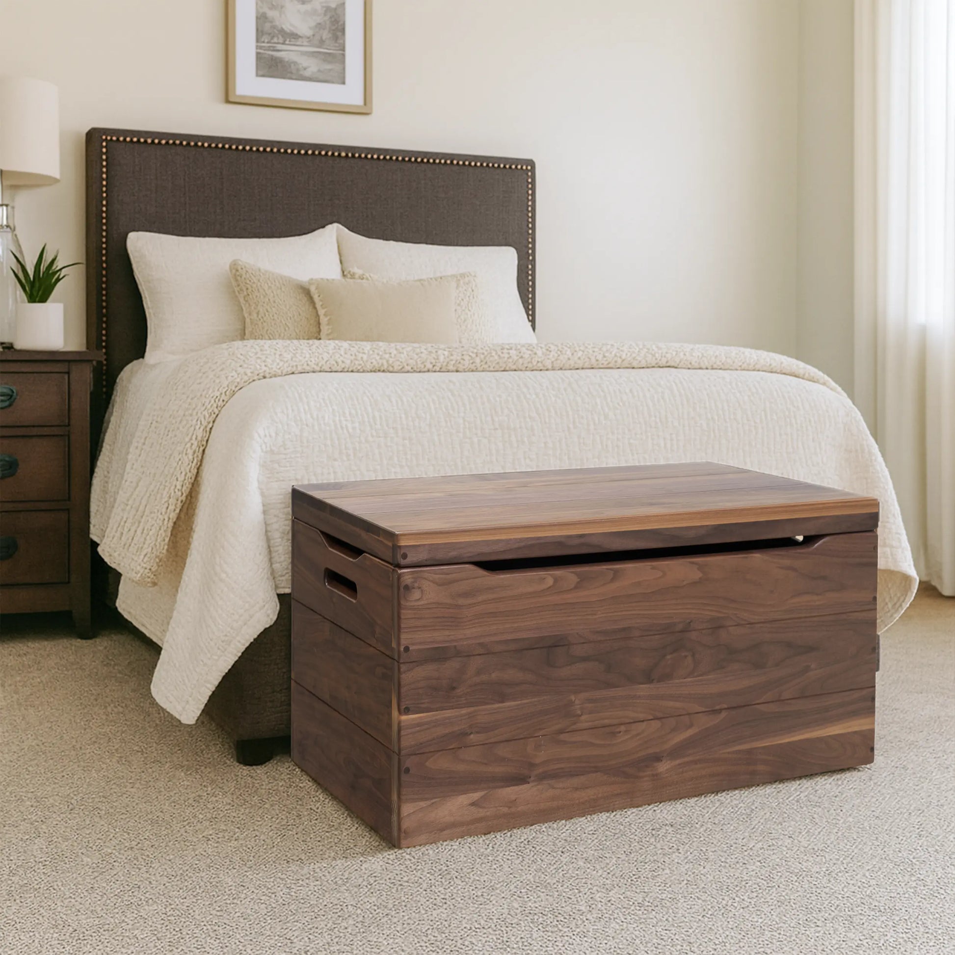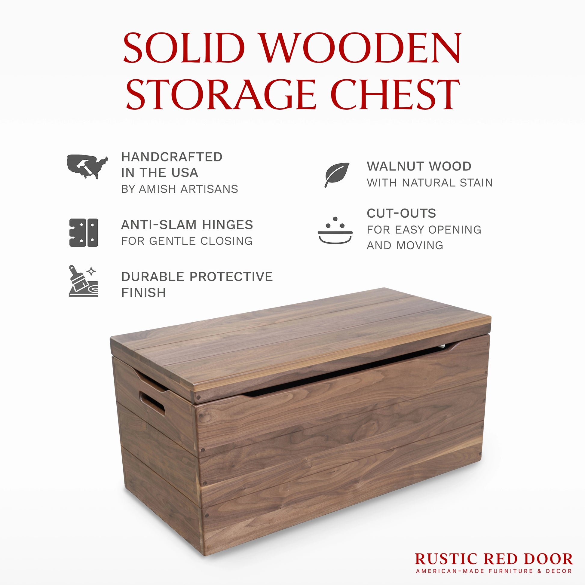 {"id":8248590139696,"title":"Palmer Walnut Blanket Chest, Natural Stain","handle":"palmer-walnut-blanket-chest","description":"\u003cp\u003e \u003c\/p\u003e\n\u003ch5\u003e\u003cstrong\u003eFeatures\u003c\/strong\u003e\u003c\/h5\u003e\n\u003cul\u003e\n\u003cli\u003eWalnut Wood\u003c\/li\u003e\n\u003cli\u003eNatural Stain\u003c\/li\u003e\n\u003cli\u003ePre-Catalyzed Polyurethane\u003c\/li\u003e\n\u003cli\u003eAnti-Slam Hinges\u003c\/li\u003e\n\u003cli\u003eThree Sides Cut Out for Easy Opening and Closing\u003c\/li\u003e\n\u003cli\u003eEngrave Option (single panel)\u003c\/li\u003e\n\u003cli\u003eShipping time will be longer if engraved\u003c\/li\u003e\n\u003cli\u003eSee our \u003ca href=\"https:\/\/rusticreddoor.com\/blogs\/rrd\/engraved-chests\" title=\"engraved chest gallery\" style=\"color: #b00304;\" target=\"_blank\"\u003egallery for engraved chest\u003c\/a\u003e\u003cspan\u003e ideas!\u003c\/span\u003e\n\u003c\/li\u003e\n\u003cli\u003e\u003cspan\u003e(Optional) Removable Tray\u003c\/span\u003e\u003c\/li\u003e\n\u003c\/ul\u003e\n\u003ch5\u003e\u003cstrong\u003eDimensions\u003c\/strong\u003e\u003c\/h5\u003e\n\u003cul\u003e\n\u003cli\u003eOutside Dimensions\u003c\/li\u003e\n\u003cul\u003e\n\u003cli\u003e24\" - 24”L x 18”D x 17”H\u003c\/li\u003e\n\u003cli\u003e30\" - 30”L x 18”D x 17”H\u003c\/li\u003e\n\u003cli\u003e36\" - 36”L x 18”D x 17”H\u003c\/li\u003e\n\u003cli\u003e42\" - 42\u003cspan\u003e”L x 18”D x 17”H\u003c\/span\u003e\n\u003c\/li\u003e\n\u003c\/ul\u003e\n\u003cli\u003eInside Dimensions\u003c\/li\u003e\n\u003cul\u003e\n\u003cli\u003e24\" - 22.5”L x 16.5”D x 14”H\u003c\/li\u003e\n\u003cli\u003e30\" - 28.5”L x 16.5”D x 14”H\u003c\/li\u003e\n\u003cli\u003e36\" - 34.5”L x 16.5”D x 14”H\u003c\/li\u003e\n\u003cli\u003e40\" - 38.5\"L\u003cspan\u003e x 16.5”D x 14”H\u003c\/span\u003e\n\u003c\/li\u003e\n\u003c\/ul\u003e\n\u003c\/ul\u003e","published_at":"2023-04-03T17:17:01-04:00","created_at":"2023-04-03T17:17:01-04:00","vendor":"Rustic Red Door Co.","type":"Chests","tags":["bf2023","palmer","walnut"],"price":64900,"price_min":64900,"price_max":142400,"available":true,"price_varies":true,"compare_at_price":null,"compare_at_price_min":0,"compare_at_price_max":0,"compare_at_price_varies":false,"variants":[{"id":49823179440432,"title":"24\" \/ No \/ No","option1":"24\"","option2":"No","option3":"No","sku":"CHST104239","requires_shipping":true,"taxable":true,"featured_image":null,"available":true,"name":"Palmer Walnut Blanket Chest, Natural Stain - 24\" \/ No \/ No","public_title":"24\" \/ No \/ No","options":["24\"","No","No"],"price":64900,"weight":0,"compare_at_price":null,"inventory_quantity":0,"inventory_management":"shopify","inventory_policy":"continue","barcode":null,"requires_selling_plan":false,"selling_plan_allocations":[]},{"id":49823179473200,"title":"24\" \/ Yes Engrave \/ No","option1":"24\"","option2":"Yes Engrave","option3":"No","sku":"CHST104239E","requires_shipping":true,"taxable":true,"featured_image":null,"available":true,"name":"Palmer Walnut Blanket Chest, Natural Stain - 24\" \/ Yes Engrave \/ No","public_title":"24\" \/ Yes Engrave \/ No","options":["24\"","Yes Engrave","No"],"price":74900,"weight":0,"compare_at_price":null,"inventory_quantity":0,"inventory_management":"shopify","inventory_policy":"continue","barcode":null,"requires_selling_plan":false,"selling_plan_allocations":[]},{"id":49823179505968,"title":"30\" \/ No \/ No","option1":"30\"","option2":"No","option3":"No","sku":"CHST104240","requires_shipping":true,"taxable":true,"featured_image":null,"available":true,"name":"Palmer Walnut Blanket Chest, Natural Stain - 30\" \/ No \/ No","public_title":"30\" \/ No \/ No","options":["30\"","No","No"],"price":74900,"weight":0,"compare_at_price":null,"inventory_quantity":0,"inventory_management":"shopify","inventory_policy":"continue","barcode":null,"requires_selling_plan":false,"selling_plan_allocations":[]},{"id":49823179538736,"title":"30\" \/ Yes Engrave \/ No","option1":"30\"","option2":"Yes Engrave","option3":"No","sku":"CHST104240E","requires_shipping":true,"taxable":true,"featured_image":null,"available":true,"name":"Palmer Walnut Blanket Chest, Natural Stain - 30\" \/ Yes Engrave \/ No","public_title":"30\" \/ Yes Engrave \/ No","options":["30\"","Yes Engrave","No"],"price":84900,"weight":0,"compare_at_price":null,"inventory_quantity":0,"inventory_management":"shopify","inventory_policy":"continue","barcode":null,"requires_selling_plan":false,"selling_plan_allocations":[]},{"id":49823179571504,"title":"36\" \/ No \/ No","option1":"36\"","option2":"No","option3":"No","sku":"CHST102588","requires_shipping":true,"taxable":true,"featured_image":null,"available":true,"name":"Palmer Walnut Blanket Chest, Natural Stain - 36\" \/ No \/ No","public_title":"36\" \/ No \/ No","options":["36\"","No","No"],"price":84900,"weight":0,"compare_at_price":null,"inventory_quantity":3,"inventory_management":"shopify","inventory_policy":"continue","barcode":null,"requires_selling_plan":false,"selling_plan_allocations":[]},{"id":49823179604272,"title":"36\" \/ Yes Engrave \/ No","option1":"36\"","option2":"Yes Engrave","option3":"No","sku":"CHST102588E","requires_shipping":true,"taxable":true,"featured_image":null,"available":true,"name":"Palmer Walnut Blanket Chest, Natural Stain - 36\" \/ Yes Engrave \/ No","public_title":"36\" \/ Yes Engrave \/ No","options":["36\"","Yes Engrave","No"],"price":94900,"weight":0,"compare_at_price":null,"inventory_quantity":0,"inventory_management":"shopify","inventory_policy":"continue","barcode":null,"requires_selling_plan":false,"selling_plan_allocations":[]},{"id":49823179637040,"title":"42\" \/ No \/ No","option1":"42\"","option2":"No","option3":"No","sku":"CHST104242","requires_shipping":true,"taxable":true,"featured_image":null,"available":true,"name":"Palmer Walnut Blanket Chest, Natural Stain - 42\" \/ No \/ No","public_title":"42\" \/ No \/ No","options":["42\"","No","No"],"price":124900