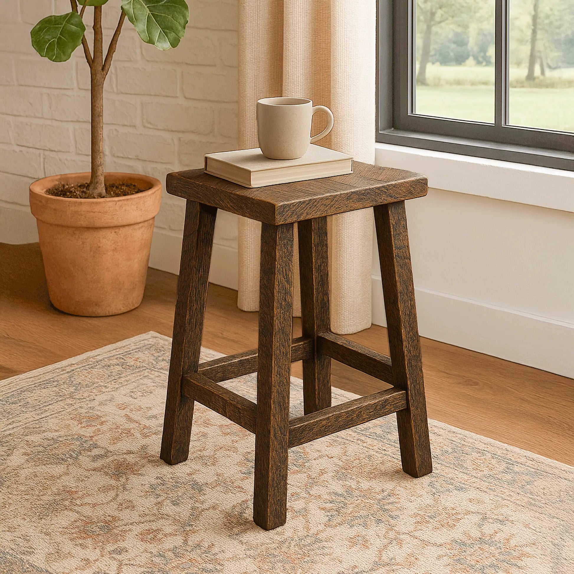 The warm color shade produced by the #3 glaze brings out the beautiful naturally occurring knots, grain lines, and saw marks that add to the personality of each wood piece. Pre-catalyzed polyurethane is applied to add a protective finish to the wood. No two stools will ever be exactly alike which adds even more interest with each set of stools.